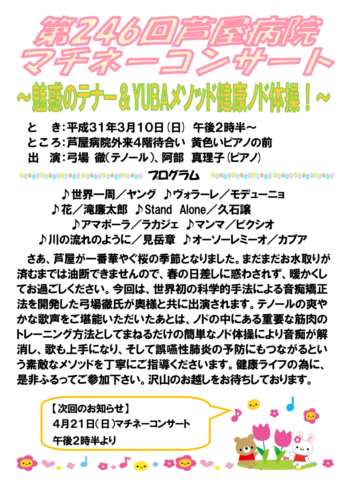 ・6/24 「弓場徹&阿部真理子のミニレクチャーコンサート「YUBAメソッドで、あっ!という間に歌上手」」置戸町生涯学習センター開館7周年記念